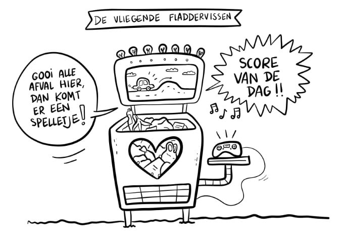 Als je de prullenbak van de Vliegende Fladdervissen gebruikt, mag je een spelletjes spelen!