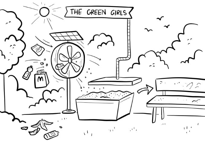 Dit ontwerpteam gebruikt enorme ventilatoren om alle afval uit de natuur te blazen. Het plastic wordt vervolgens omgevormd tot nieuwe producten, waaronder banken.
